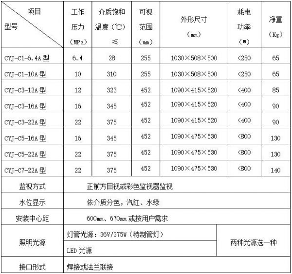 `CYJ型窗式高壓、超高壓彩色液位計是用于各發(fā)電廠、石油化工行業(yè)及各工礦企業(yè)的蒸汽鍋爐或其它壓力容器監(jiān)測水位的一次就地直讀儀表。它是在總結(jié)國內(nèi)外各種透射式雙色水位計優(yōu)點基礎(chǔ)上新研制的長窗式高壓、超高壓雙色水位計,用汽紅水綠顯示液位,無水全紅、滿水全綠。紅綠色界面即為實際水位??稍诂F(xiàn)場直接觀察也可以配我公司生產(chǎn)的彩色工業(yè)電視監(jiān)視系統(tǒng),在控制室內(nèi)的監(jiān)視器熒屏上遠(yuǎn)程監(jiān)測現(xiàn)場實際水位。它與其它雙色水位計相比較,具有如下幾種特點: